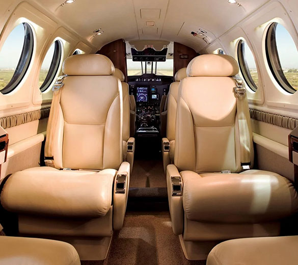 The King Air 200/250 features a pressurized executive cabin with comfortable club-style seating, fold-out tables, and ample legroom. Large oval windows provide natural light, while a quiet cabin environment ensures a smooth and productive journey for business and VIP travelers.