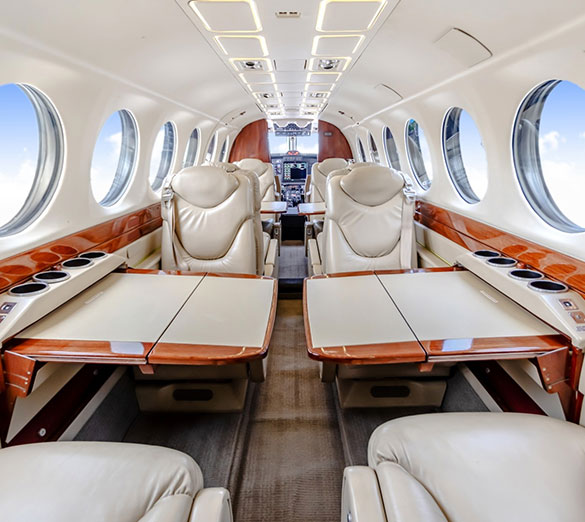 The King Air 300/350 features a refined, pressurized cabin with executive club seating, fold-out worktables, and generous legroom. Large oval windows enhance natural light, while advanced soundproofing ensures a quiet and comfortable environment for business and VIP travel.