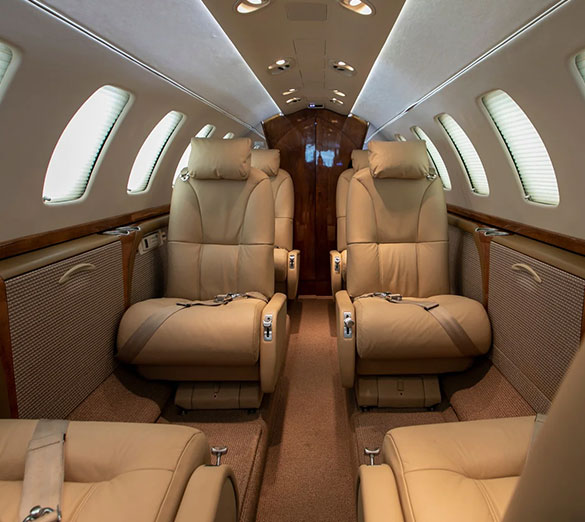 The Citation CJ2+ features a comfortable and well-appointed cabin with executive seating, fold-out worktables, and ample natural light from large windows. Its quiet cabin environment ensures a smooth and productive journey for business and VIP travelers.